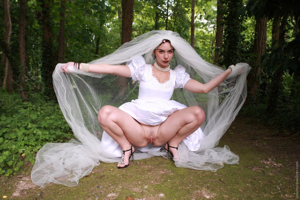 Dans une robe de mariée sans culotte